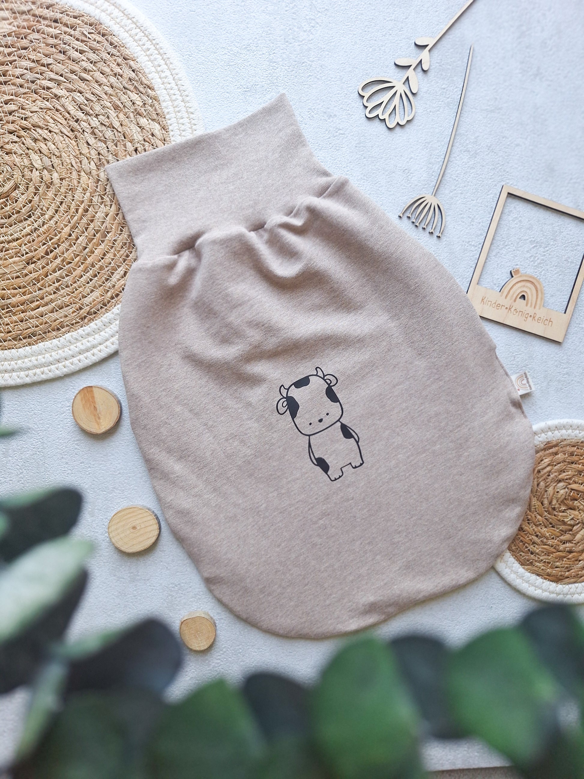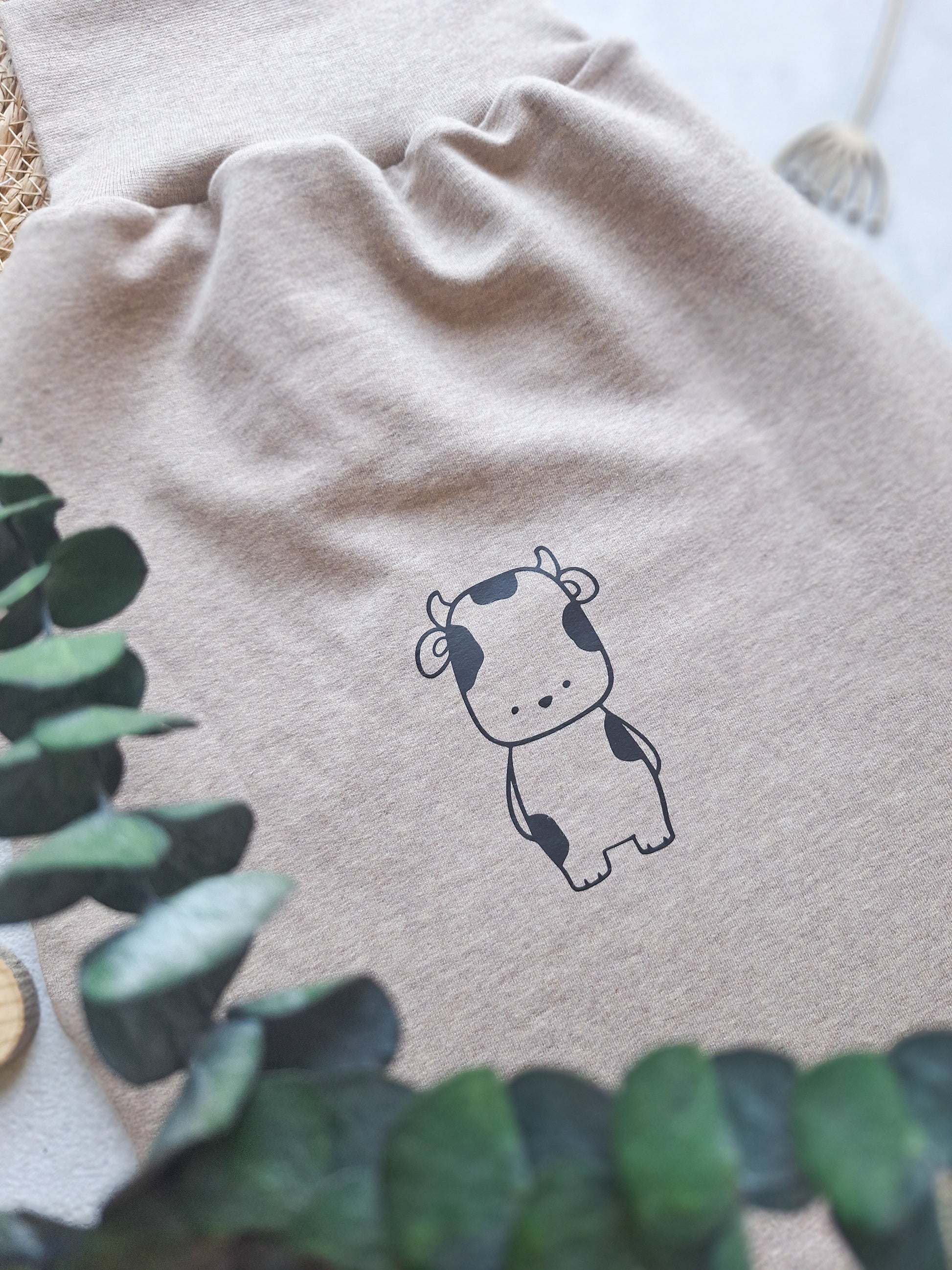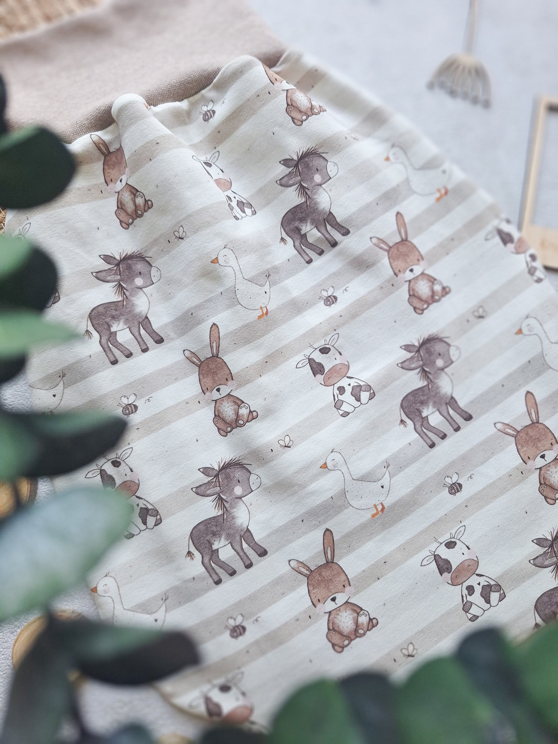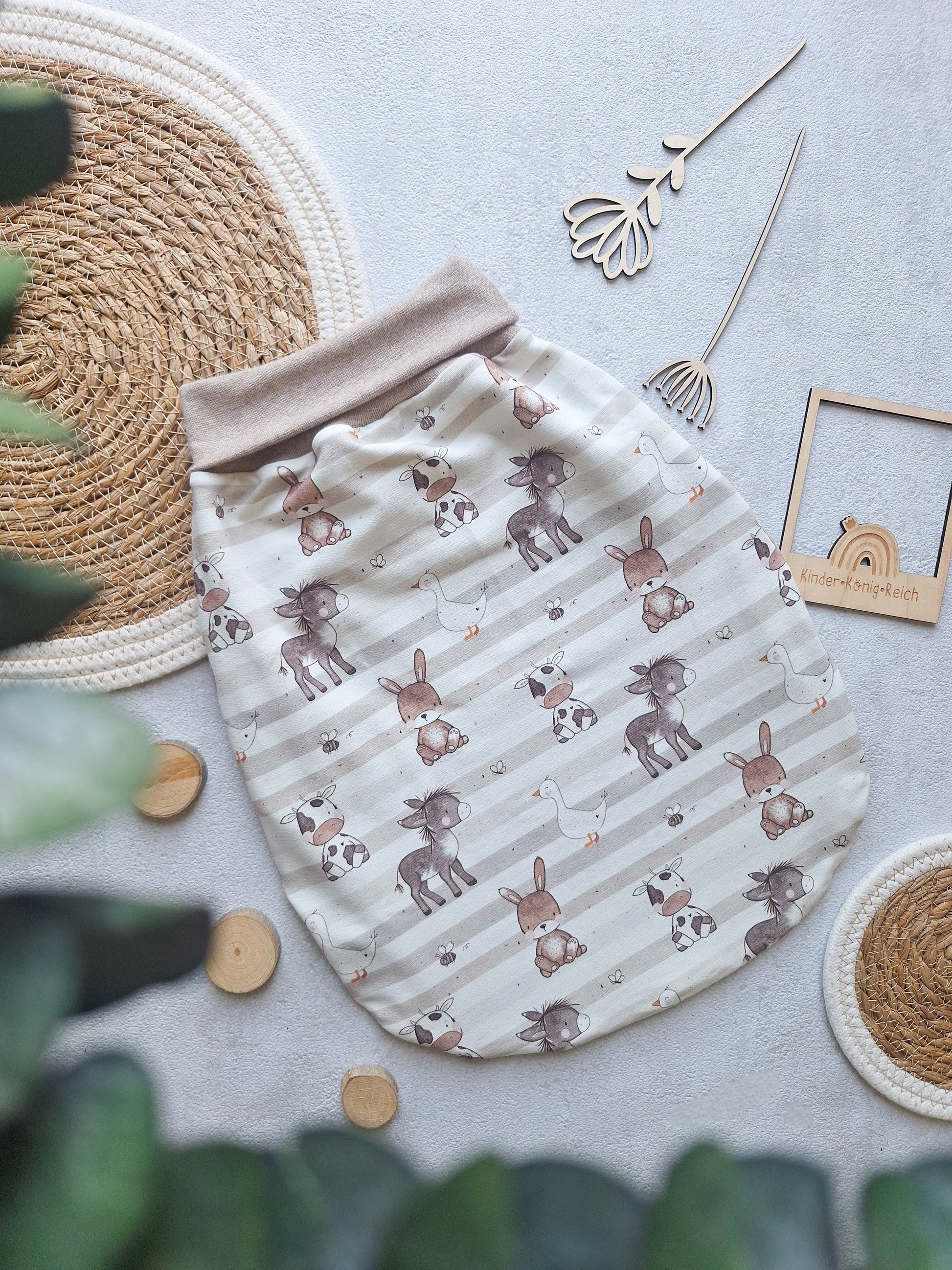 Wendbarer, doppellagiger Pucksack von ungefähr 0-6 Monaten mit Bauernhoftieren und "Muh"-Plott.