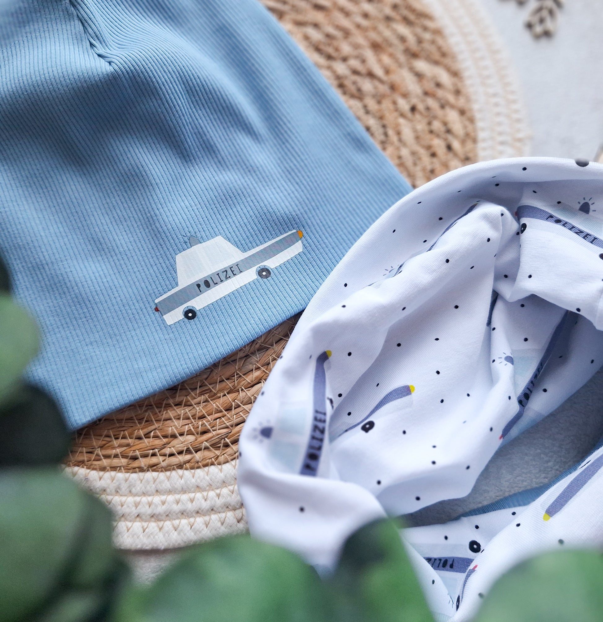 Set, bestehend aus Ribbeanie mit Bügelbild "Polizei" und dazupassender Loop.
