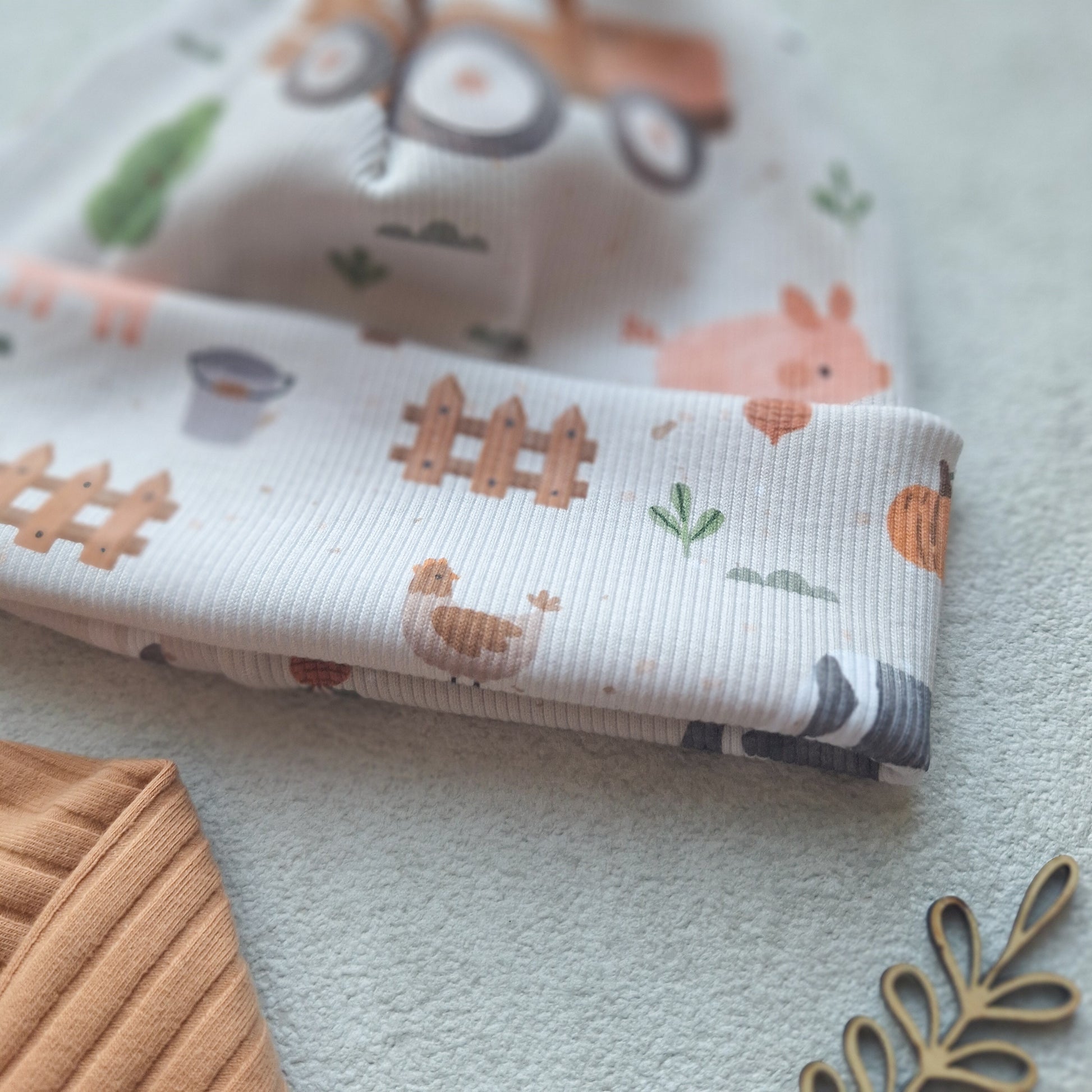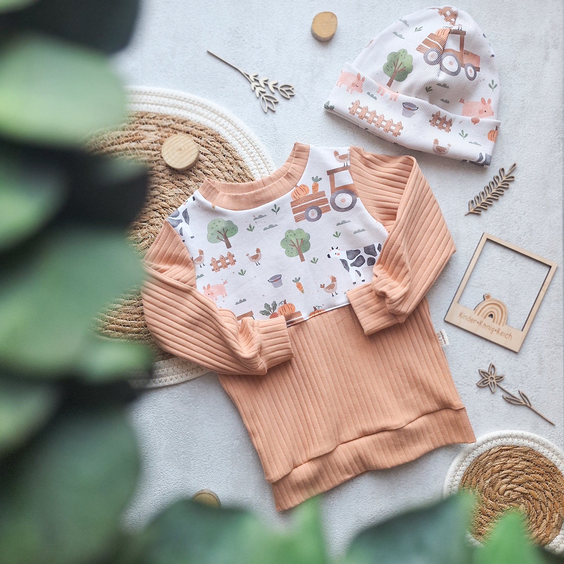 Sweater mit Teilung mit passender Beanie aus Ribjersey in Gr. 45-50cm.