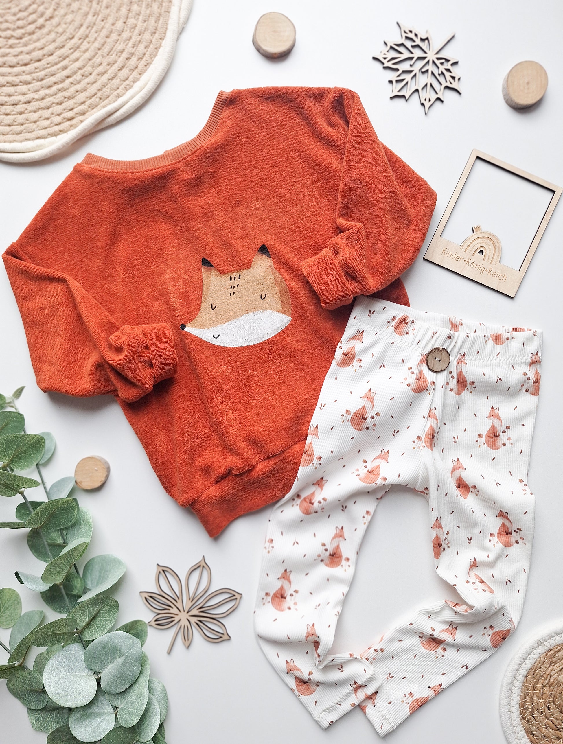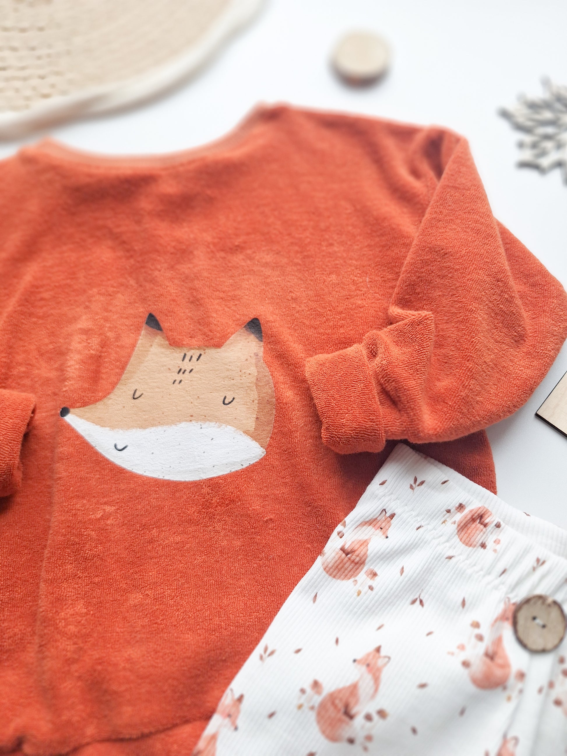 Sweater aus Frottee mit Bügelbild "Herbstfuchs" und Leggings aus Ribjersey mit Knopf.